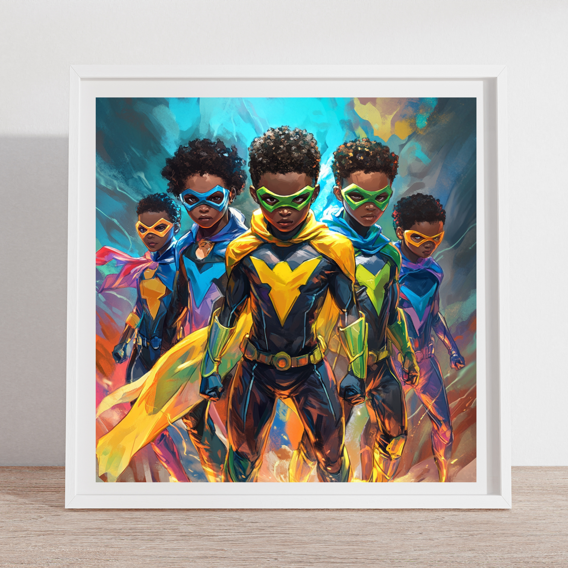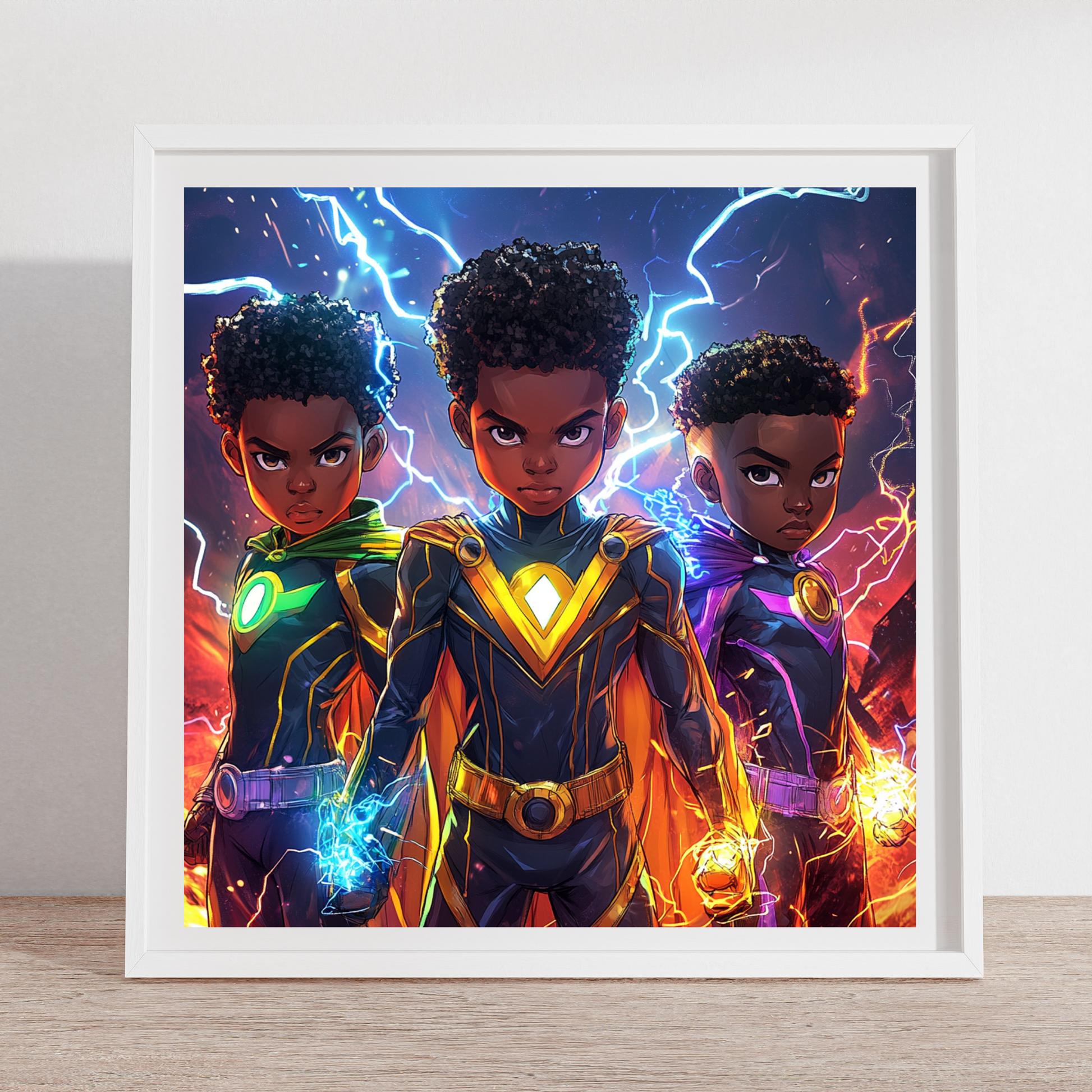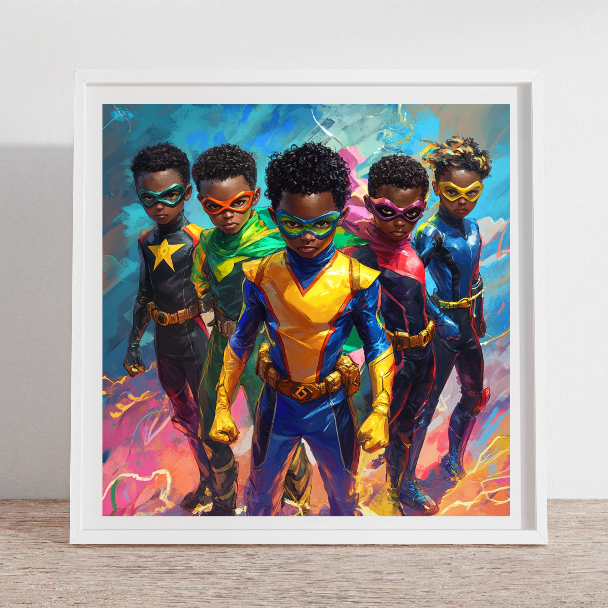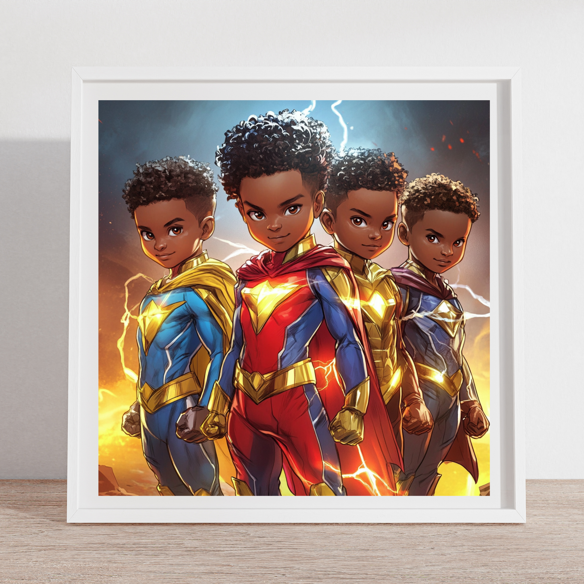 Bring boldness, pride, and power to your space with "Young Hero Rising," a stunning digital wall art piece celebrating the strength and imagination of a young African American boy superhero.