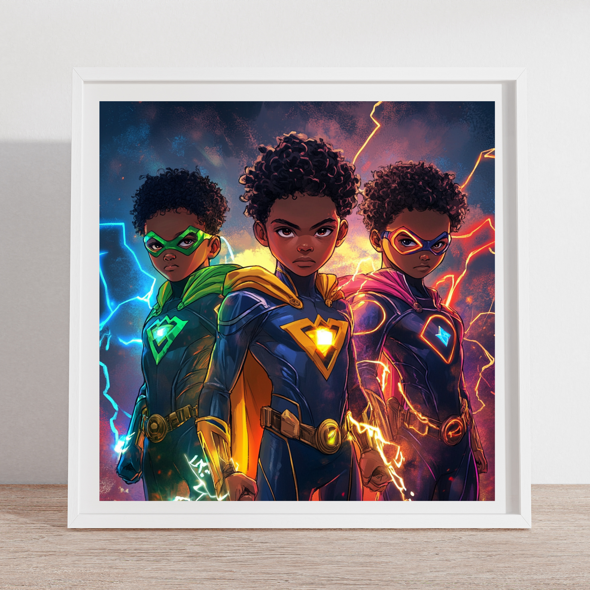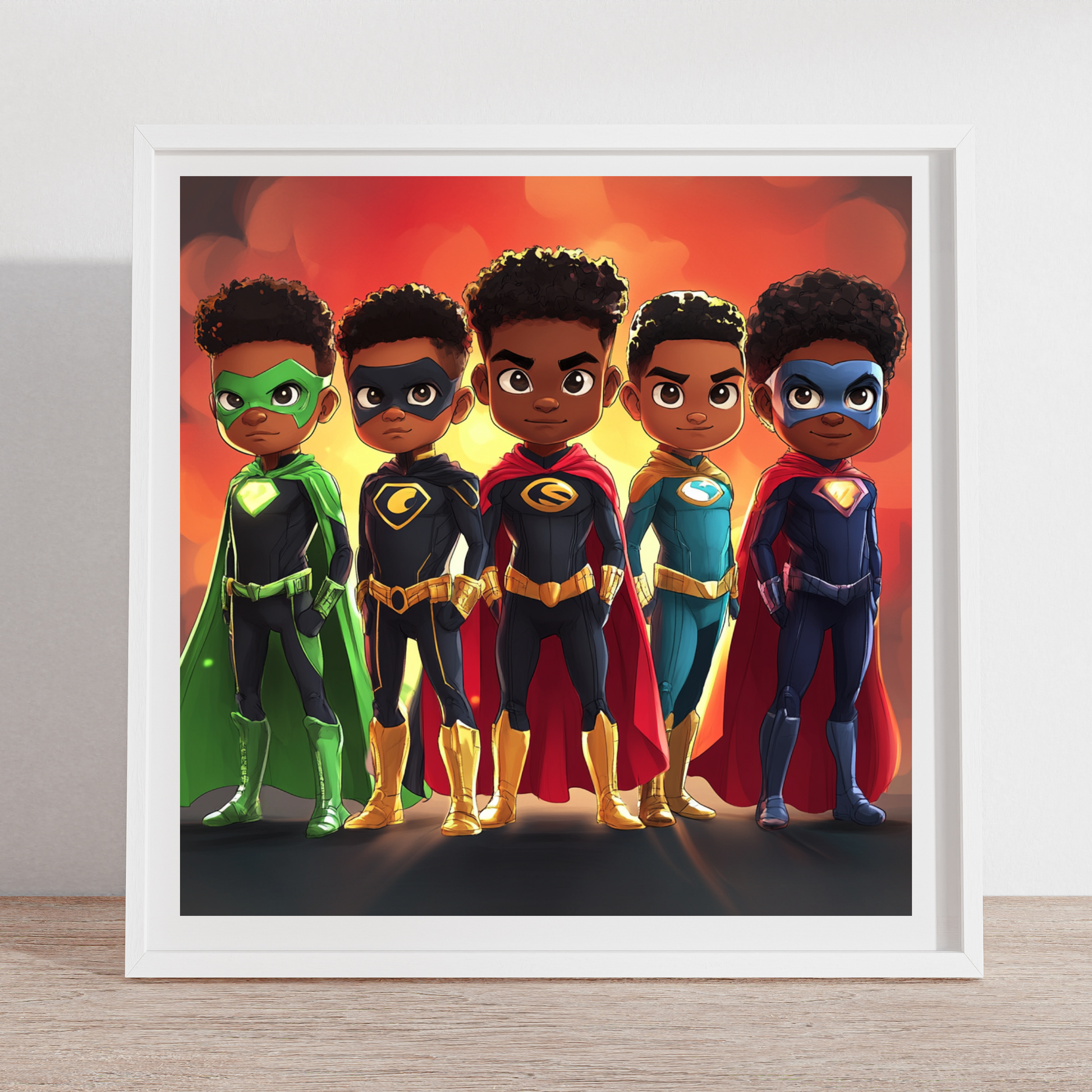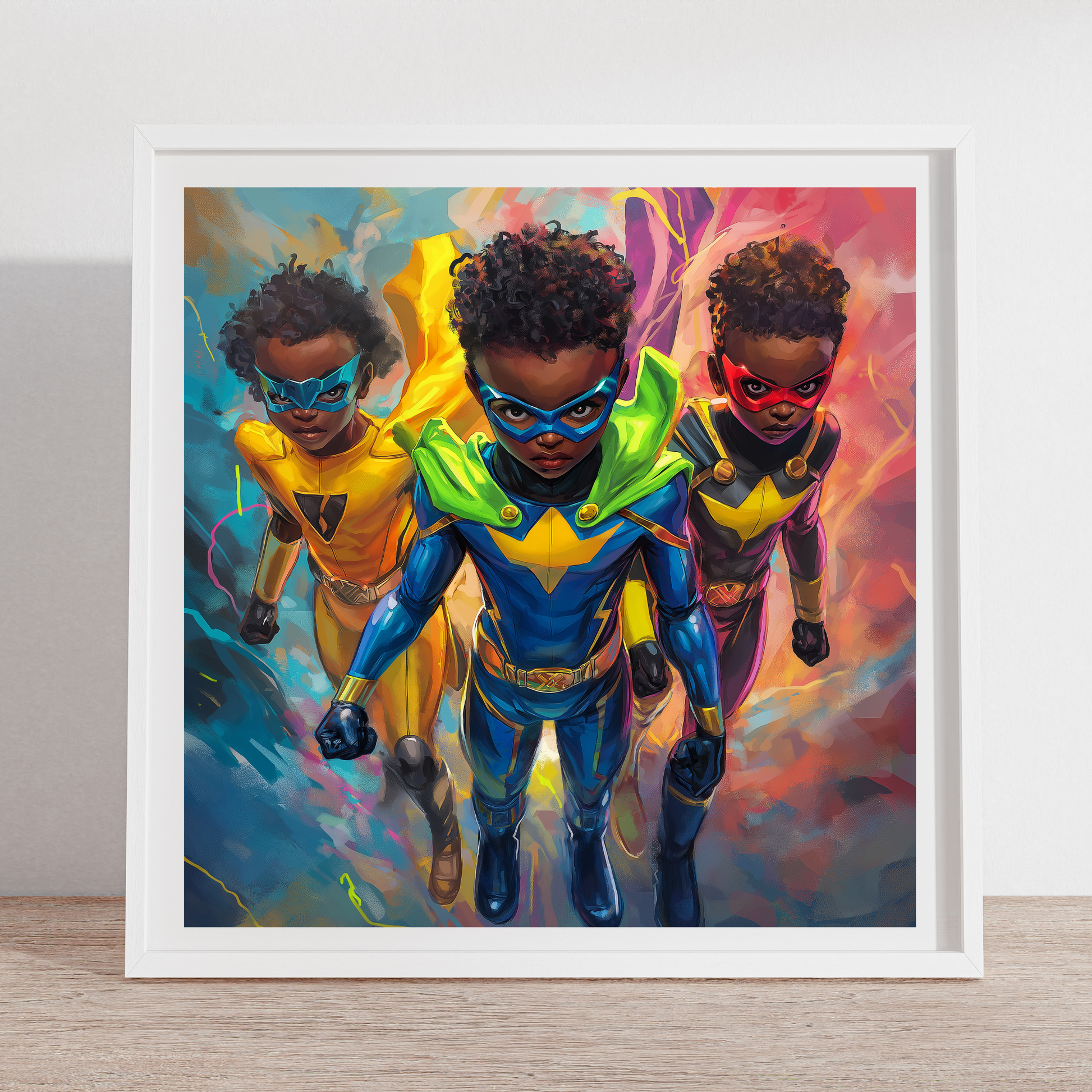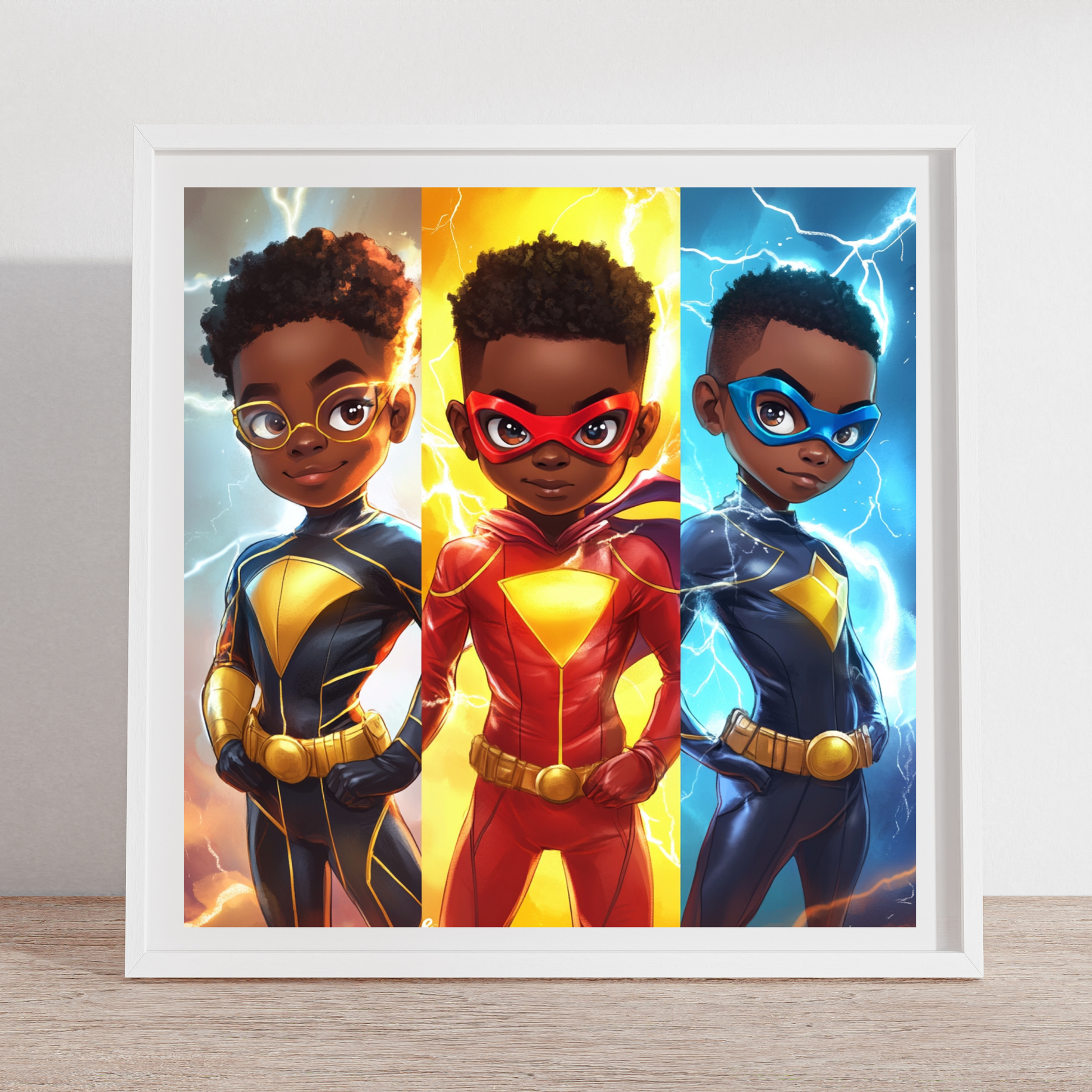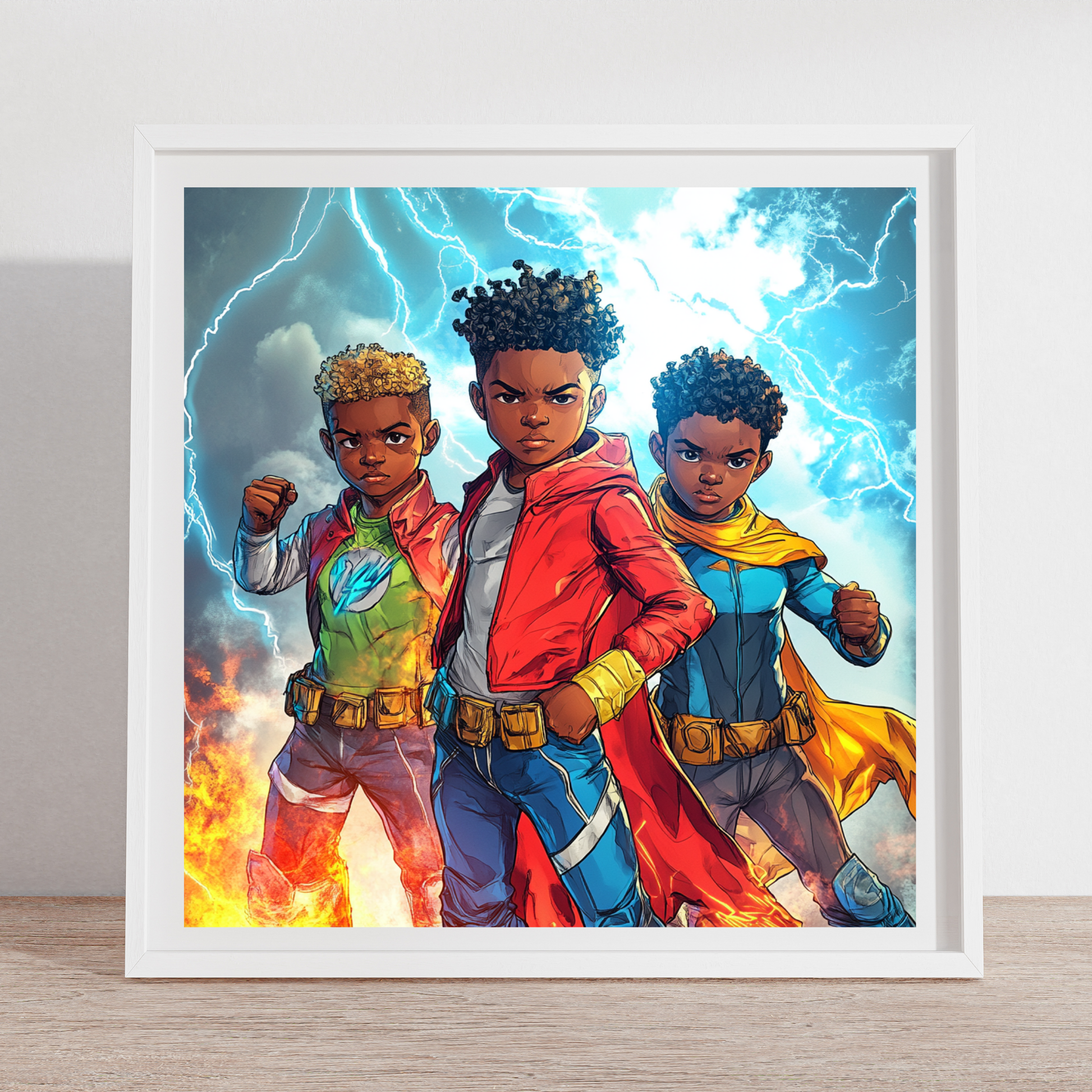 Bring boldness, pride, and power to your space with "Young Hero Rising," a stunning digital wall art piece celebrating the strength and imagination of a young African American boy superhero.
