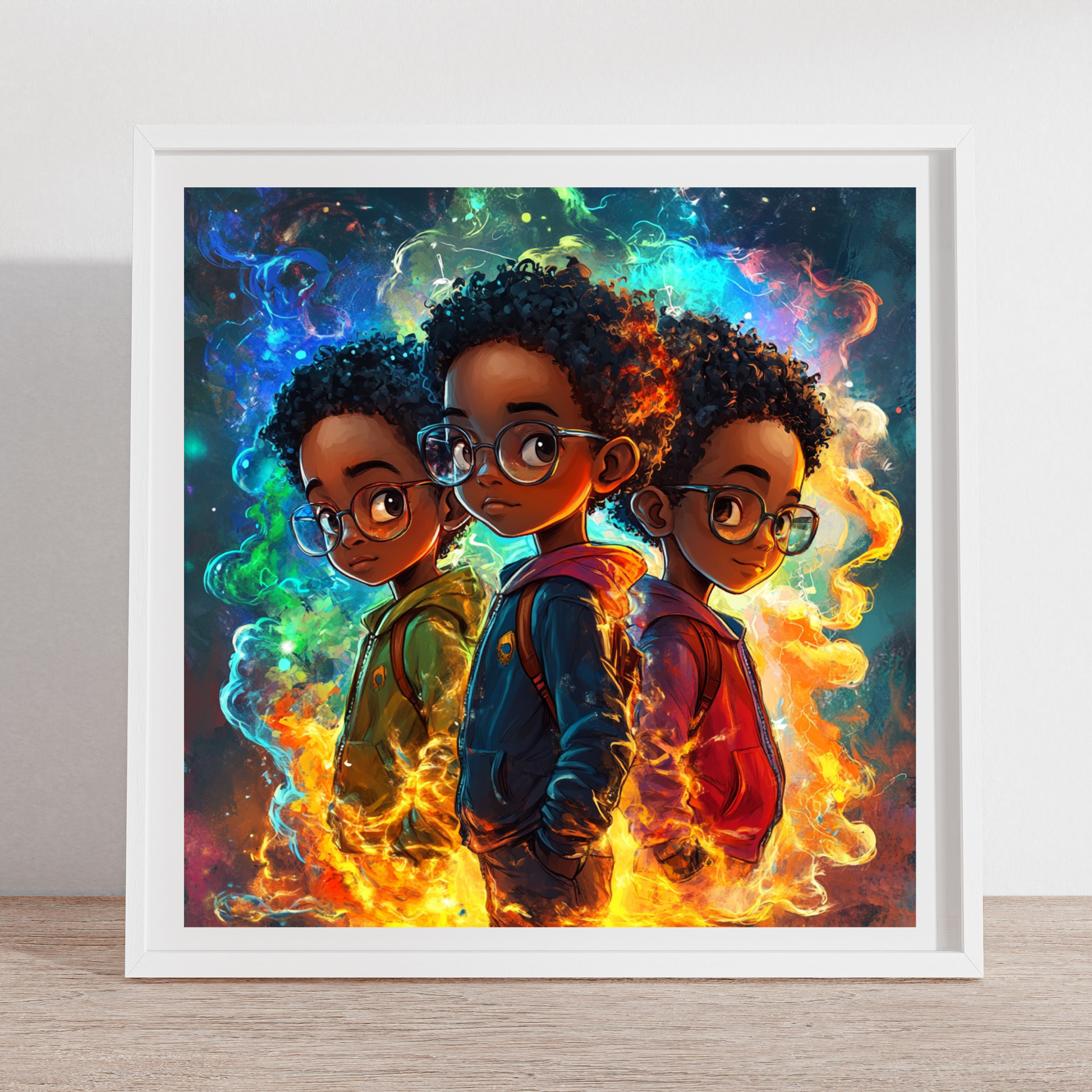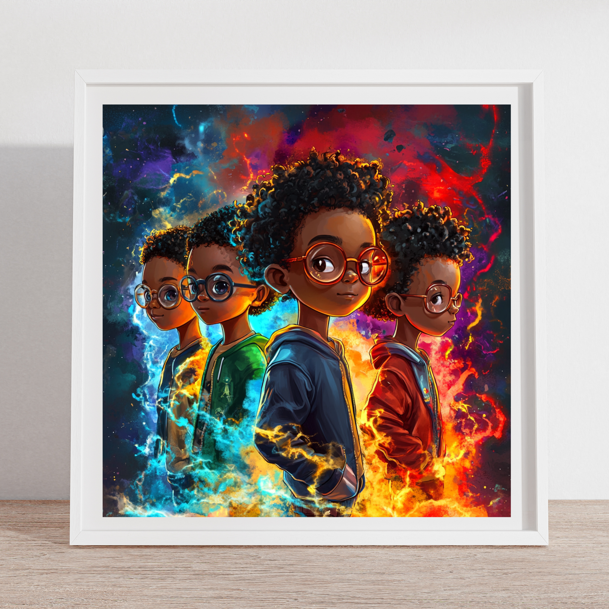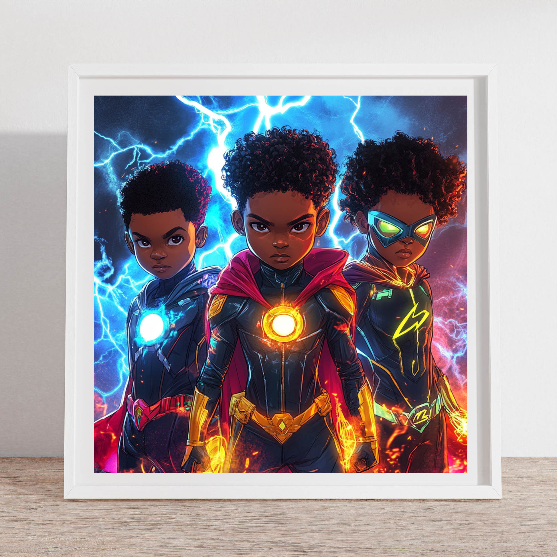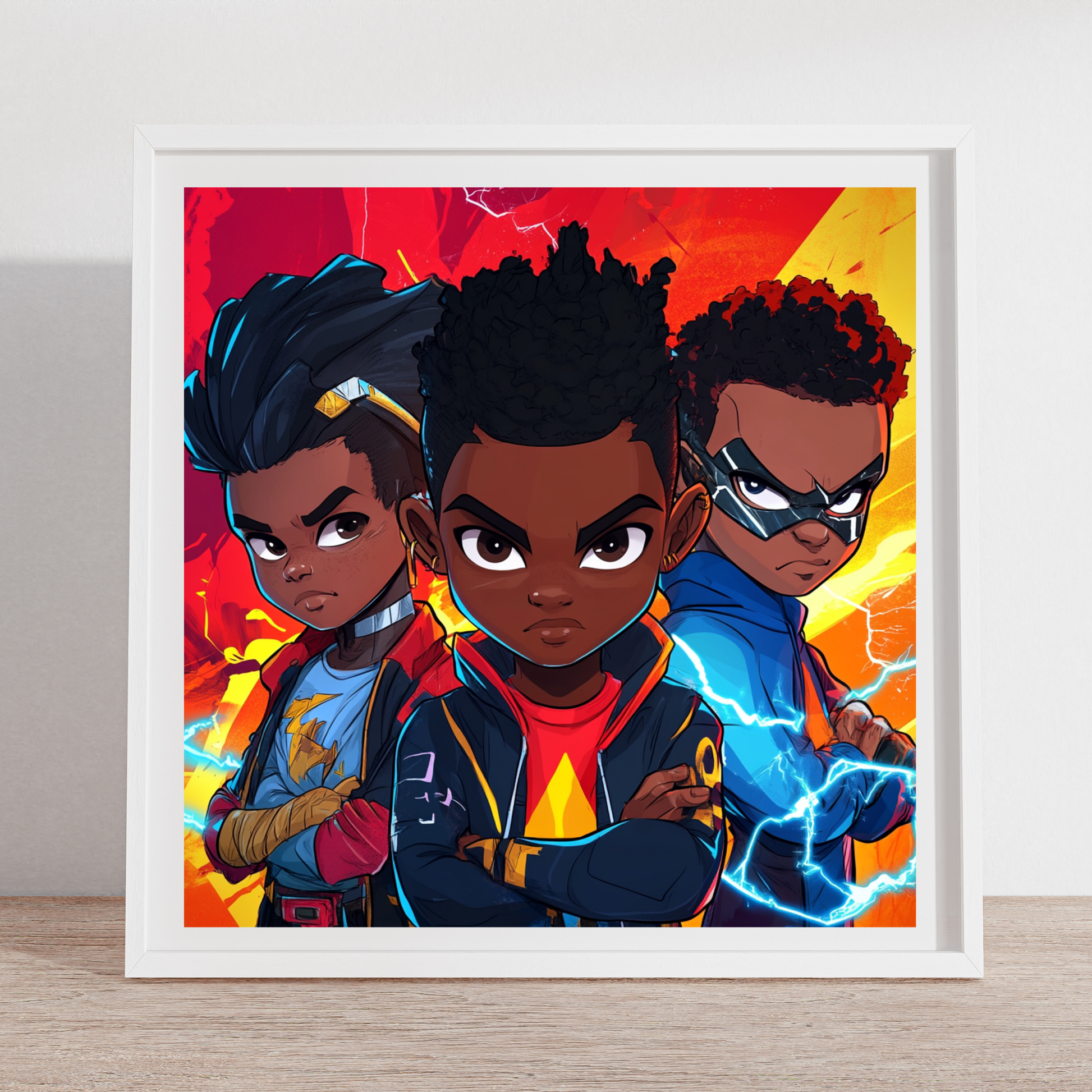 Bring boldness, pride, and power to your space with "Young Hero Rising," a stunning digital wall art piece celebrating the strength and imagination of a young African American boy superhero.