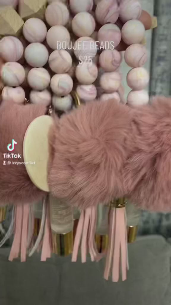 Elevate your style with this fashionable keychain set featuring a silicone wristlet, tassel, new lip gloss, wooden medallion, and pom for a trendy and unique look.